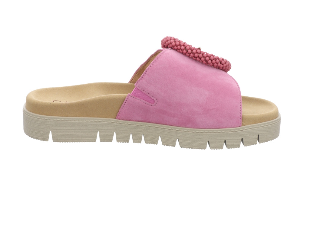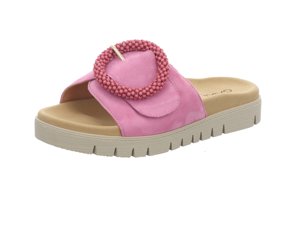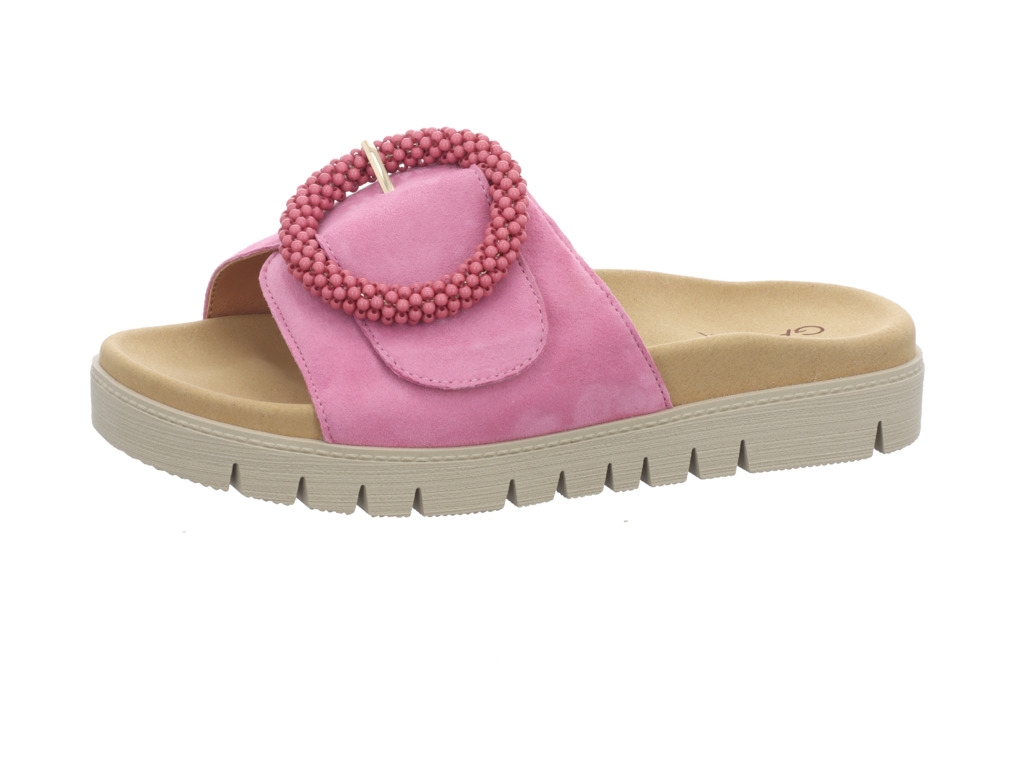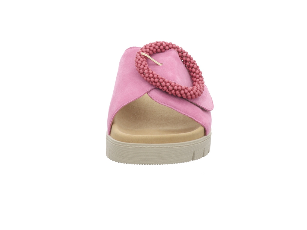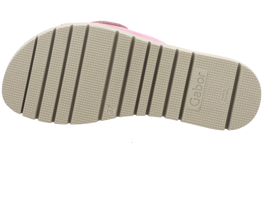 Mit dieser flachen und modischen Pantolette von Gabor kann der Sommer kommen. Das weiche Obermaterial in der Farbe rosa/pink schmiegt sich gut an den Fuß. Das Modell passt im Sommer zu nahezu allen Oberteilen.