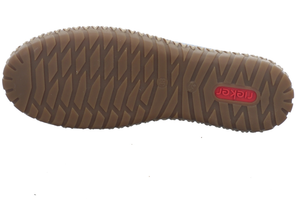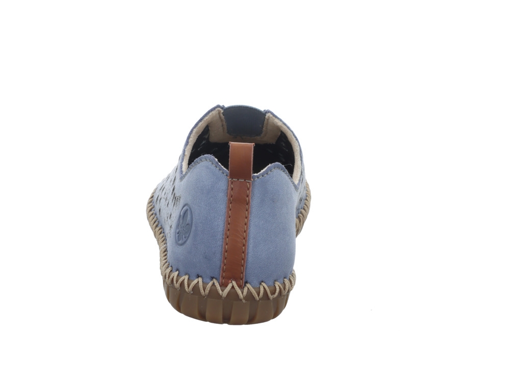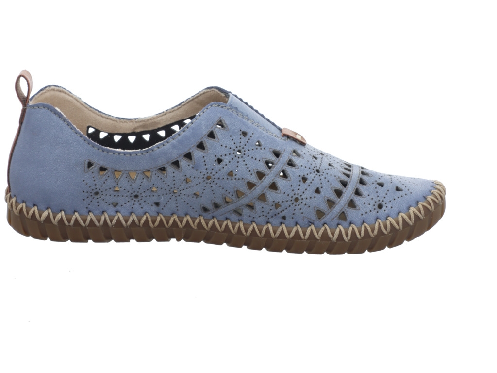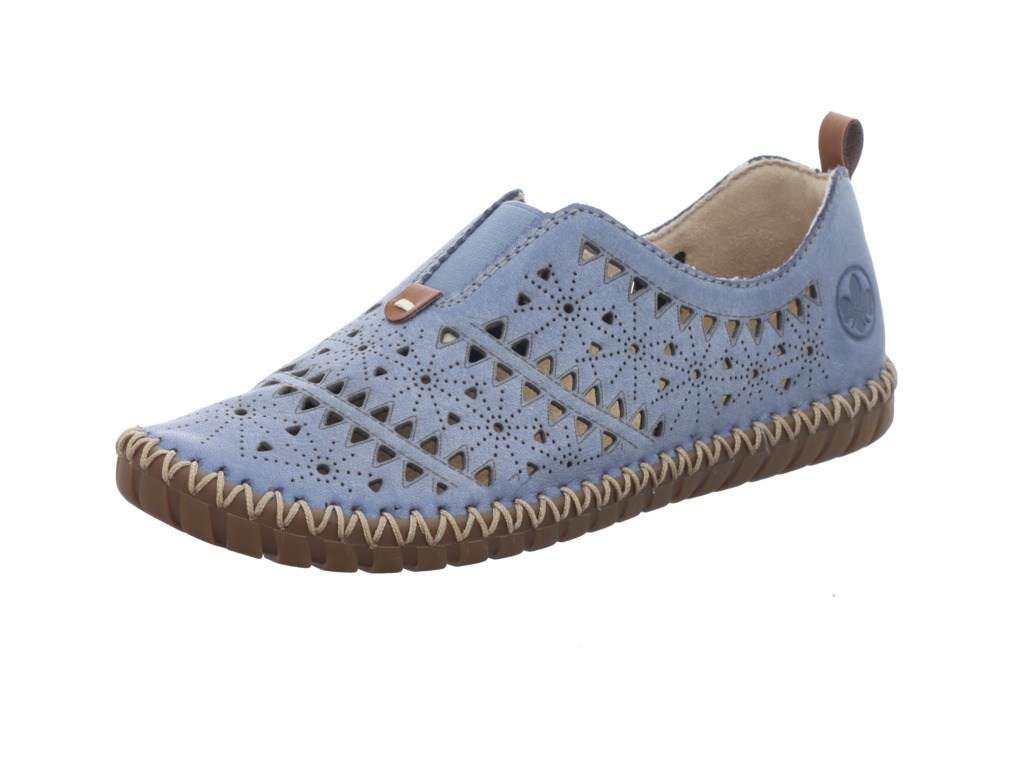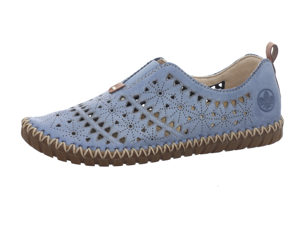 Dieser bequeme Sommer-Slipper von Rieker verbindet gute Passform mit gelungener, sommerlicher Optik in blau. Der Fuß ist angenehm trocken und man hat dennoch Halt.